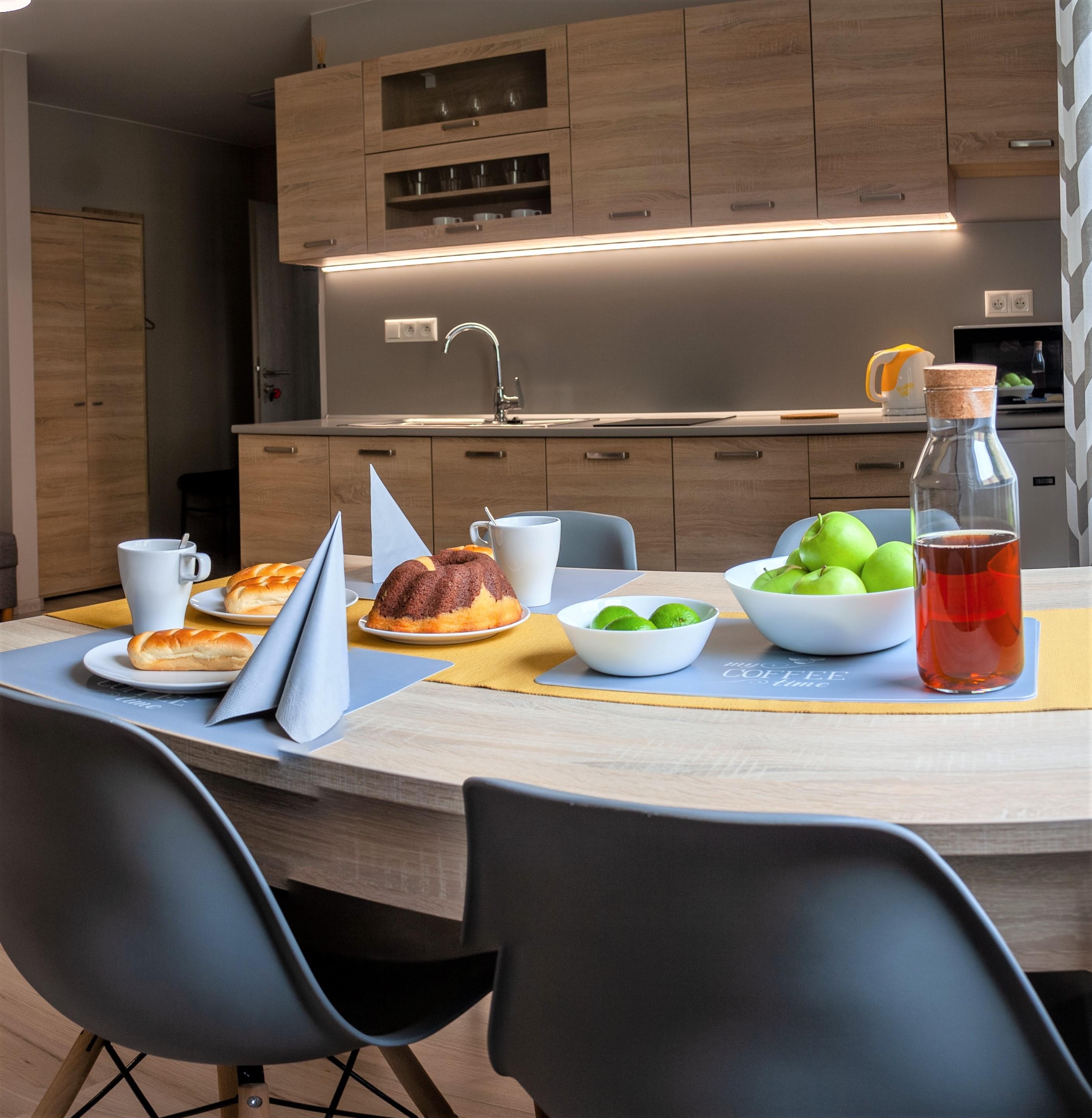 Behind the corridor there is spacious living room with fully- equipped kitchen, dining area, sofa-bed, studio couch, small table and TV.