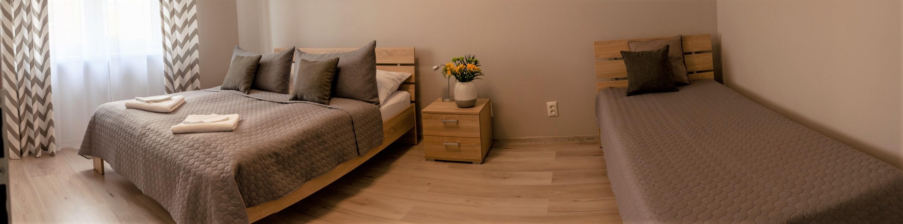 Next to the living room there is a bedroom with double bed and single bed.