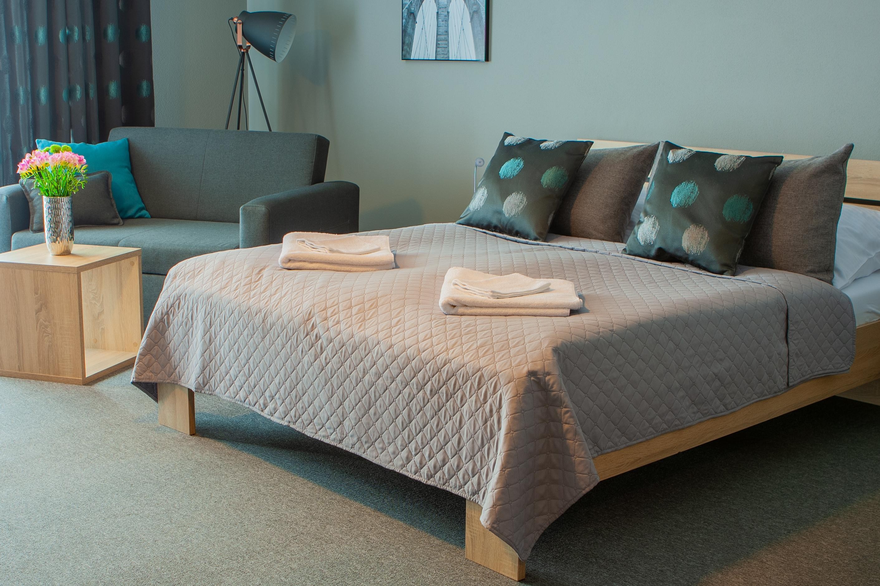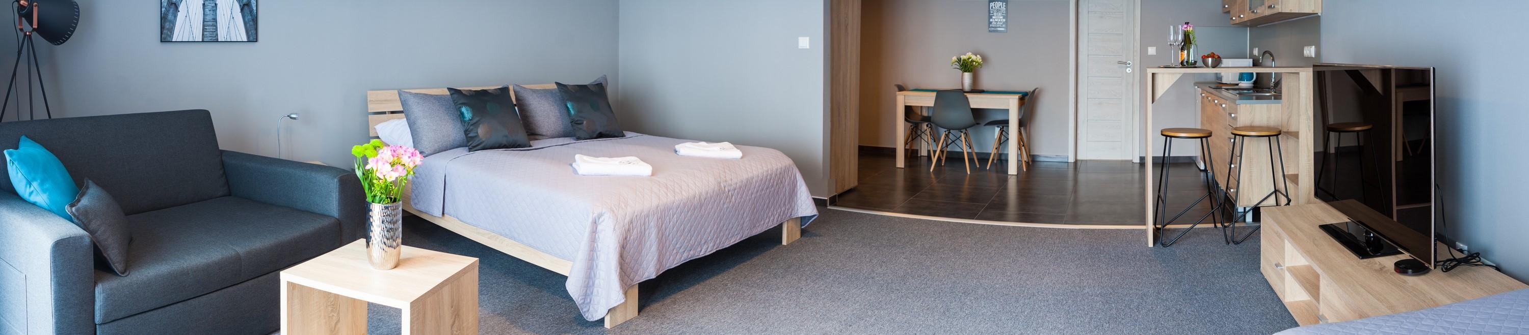 W kolei to jest przestronna sypialnia z podwójnym łóżkiem, łóżkiem jednoosobowym, sofa rozkładana, stolikiem i telewizją.